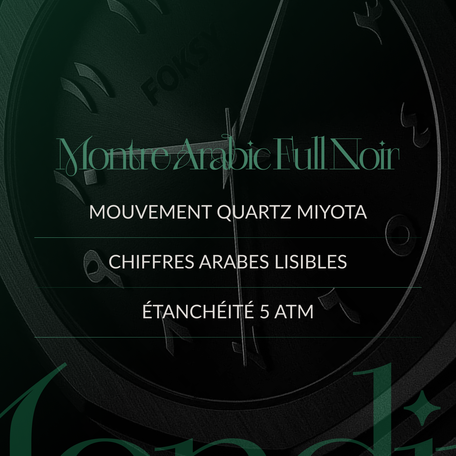 La Montre Arabic Full Noir incarne l’élégance contemporaine avec une touche culturelle forte. Son cadran noir profond est orné de chiffres arabes subtils et propulsé par un mouvement Quartz Miyota d’origine japonaise, reconnu pour sa fiabilité.