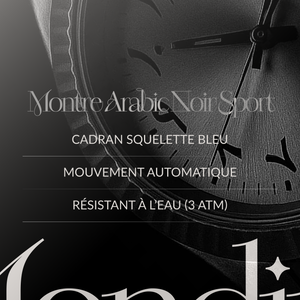 La Montre Arabic Noir Sport séduit par son design technique et sa profondeur symbolique. Son cadran squelette bleu intense révèle le mouvement automatique avec une élégance brute, tandis que les chiffres arabes apportent une touche culturelle distinctive.
