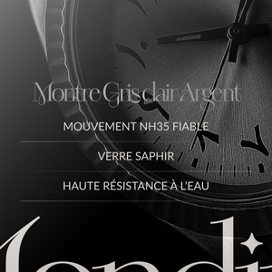 La Montre Gris Clair Argent séduit par son design raffiné et sa finition soignée. Son cadran épuré couleur argent clair reflète la lumière avec subtilité, tandis que son bracelet en acier inoxydable offre confort et robustesse.